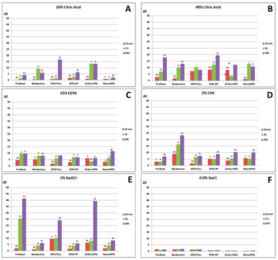 Mean ΔE values of CSCs materials after contact with irrigation solutions for different durations. (A) 10% CA; (B) 40% CA; (C) 15% EDTA; (D) 2% NaOCl; (E) 2% CHX; (F) 0.9% NaCl. (The same letters indicate statistically significant differences between different time points within the material group (p < 0.05)).