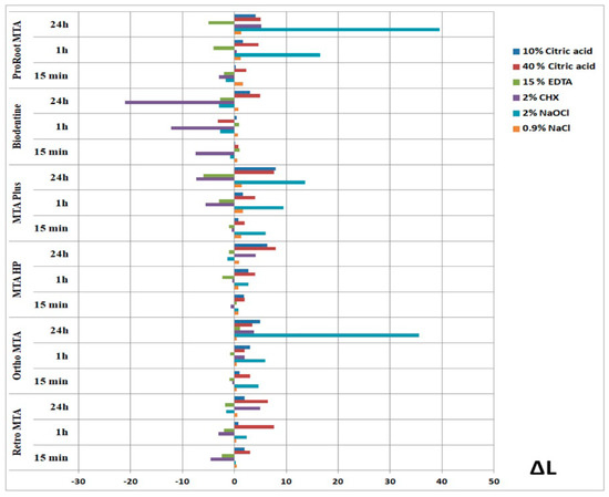 Mean ΔL values of CSCs materials after contact with irrigation solutions for different durations.