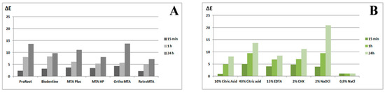 According to spectrophotometric measurements, there was less color change after immersion in EDTA than after immersion in CA (p < 0.05). There were statistically significant differences between color measurements before immersion and after immersion for 15 min, 1 h, and 24 h for all materials (P < 0.05) (Figure 3). No changes in the colors or structures of the materials were observed with the naked eye (scale 0, a) (Figure 2 and Table 2).