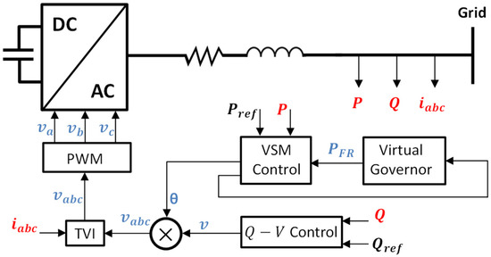 In this work, the VSM-type control approach for BESS power converter interfaces was adopted since it has been recognized as an effective solution for providing virtual inertia and damping to the power system [5,6,7]. A simplified modeling approach was adopted for the VSM operating in the grid-forming mode, which recalls the principles of the swing equation with damping and inertia [5]. A general overview of the implemented dynamic model is presented in Figure 1, including the main control blocks that are described in the next subsections being also identified.