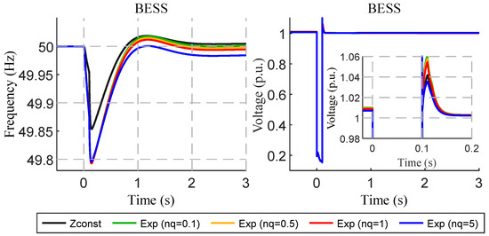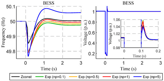 This section presents a sensitivity analysis with respect to the grid dynamics considering static load modeling. Thus, two distinct load models were analyzed: constant impedance and exponential load models. The results of the corresponding analysis are presented in Figure 7 and Figure 8. In both figures, the network frequency behavior for the cases where all the network loads are represented by constant impedance load models (Zconst) and exponential load models (Exp) is compared. However, in Figure 7, a sensitivity analysis is presented regarding the exponential model active power consumption coefficient ( value was fixed to 1), while in Figure 8, the same analysis was performed for the reactive power consumption coefficient ( value was fixed to 1). From the obtained results, it can be concluded that the variation in the exponential load model coefficients has a limited impact on the network dynamic behavior. Moreover, all the considered test cases present a smooth frequency recovery, returning to its nominal value approximately 1 s after the fault clearance.