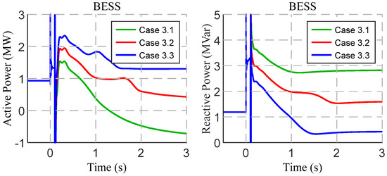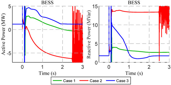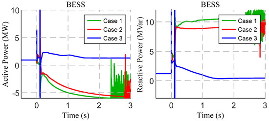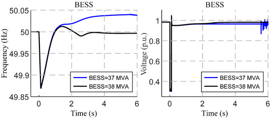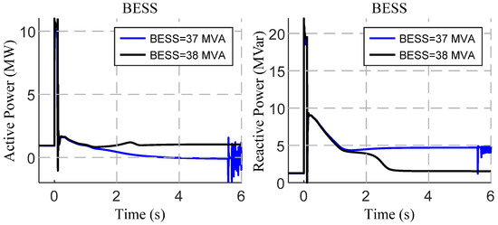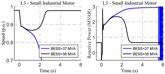Taking into account the load distribution presented in Table 2, it is intended to determine the minimum required BESS power converter capacity that ensures the post-fault recovery of all IM loads. As can be observed in Figure 9, for a BESS power converter sizing lower than 38 MVA, the small industrial motor connected to L3 stalls following the fault clearance. This is due to the large reactive power consumption required by the IM after the network fault clearance, which demands a large reactive power from the BESS power converter for about 2–3 s after the voltage recovery, as it can be observed in Figure 10. Furthermore, in Figure 11, the network frequency and voltage measured at bus B1 are depicted, with the large voltage oscillations for the 37 MVA BESS power converter case being notable, which is a consequence of the L3 small industrial motor stall. In both cases, a similar network frequency drop induced by the short circuit is observed. From this analysis, it is concluded that the initial BESS power converter sizing is not suitable when considering dynamic load modeling (it is intended for the post-fault recovery of all IM loads).