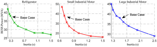 The influence of IM inertia on the grid-forming BESS power converter sizing is analyzed in this subsection. The default inertia constant of each IM type is available in Table A1 (in Appendix A). In Figure 12, the correspondent results are shown, where for each inertia value, the correspondent required minimum BESS power converter sizing for assuring the successful recovery of all IM loads following fault clearance is presented. Note that three independent sensitivity analyses were performed for each IM class. In each analysis, only the inertia constant of one IM class was modified (e.g., for the IM refrigerator type analysis—green line in Figure 12—the inertia constant of the refrigerator-type IM was varied within the range presented on the x-axis, while the inertia constants of the small and large industrial motor types remained at the corresponding default values—Table A1). It was concluded that increasing the IM inertia is beneficial since it allows reducing the BESS converter power sizing. This is due to the fact that higher IM inertia contributes to lower IM speed variations and hence lower recovery currents following fault clearance.
