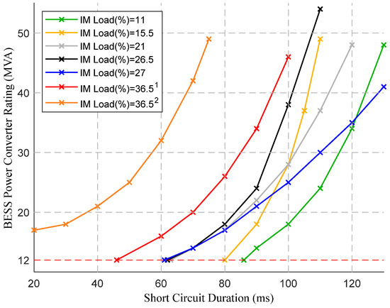 This analysis intends to address the influence of the network fault duration on the BESS power sizing. In this sense, a sensitivity analysis is presented in Figure 13, showing the minimum required BESS power converter capacity for distinct short-circuit times. Note that all the different IM load percentage scenarios presented in Table 3 were considered (“” corresponds to “L3 + L4 + L5”, while “” corresponds to “L2”). As expected, the longer short circuits require a higher BESS power capacity.