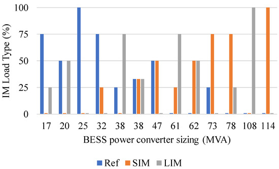 Lastly, the influence of the IM load composition on the required BESS power converter capacity is analyzed. Therefore, in Figure 14, the results of the performed analysis are shown, matching each IM load composition scenario with the respective minimum BESS power converter capacity (the refrigerator and small and large industrial IM loads are represented as Ref, SIM and LIM, respectively). As it can be observed, different IM load compositions lead to different BESS power converter sizing requirements. Thus, it is noticeable that both the small and, in particular, the large industrial IM load types require a larger BESS power converter capacity compared with the refrigerator motor type.