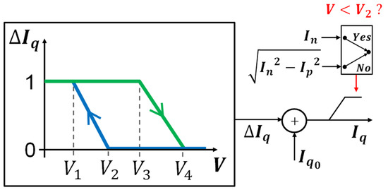 Reactive power–voltage control (represented by the “Q–V Control” block depicted in Figure 1) is responsible for defining the converter voltage magnitude as a function of the reactive power—Figure 3. Thus, and are the reference and the measured reactive power values, respectively, is the control loop time constant, is the reactive power–voltage droop control gain and and are the voltage reference and the amplitude of the output voltage to be synthetized by the converter interface.