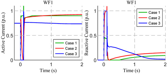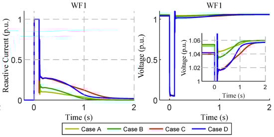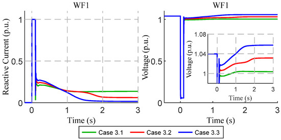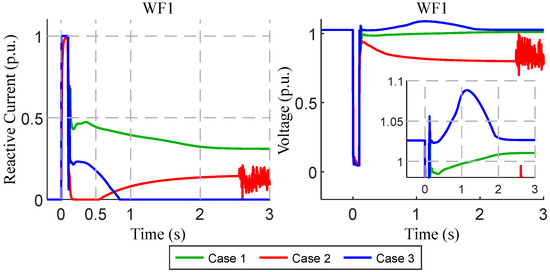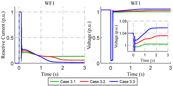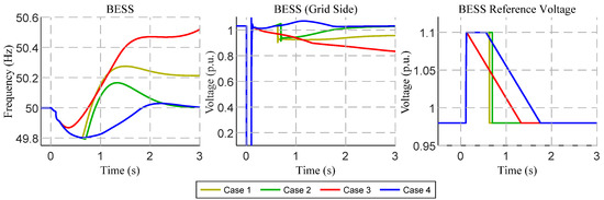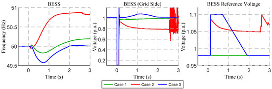 Hence, in extreme operating conditions with large shares of IM loads, it may be interesting to simultaneously implement and adopt the two considered solutions. For this purpose, in this section, the same operational scenario was considered (Table 1); however, this time, 42.5% of IM load was integrated ( and were modeled as IM loads—see Table 2). Thus, three distinct test cases were compared: (Case 1) the FRT strategy presented in Figure 15 was implemented in the grid-following units, where = 0.5 p.u., = 0.9 p.u., = 0.9 p.u. and = 1.06 p.u. (same parametrization as Section 5.1.2), with the VSM reference voltage being fixed to = 0.98 p.u.; (Case 2) the implemented FRT strategy in the grid-following units corresponds to the strategy presented in Section 2.2, where the voltage magnitude control strategy presented in Figure 27 was implemented in the BESS ( = 0.5 p.u., = 0.8 p.u., = 1 p.u., = 1.03 p.u., = 0.98 p.u., = 1.1 p.u. and a limitation ramp of −0.1 p.u. (V)/s—same parametrization as Section 5.2.2); (Case 3) both proposed strategies were considered, using the parametrization of Case 1 and Case 2.