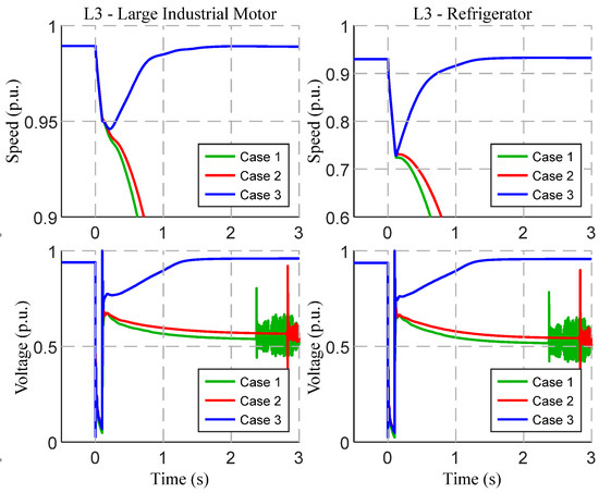L3 large industrial motor (left) and refrigerator type IM loads speeds and terminal voltages.