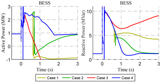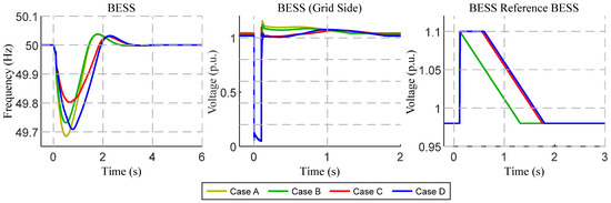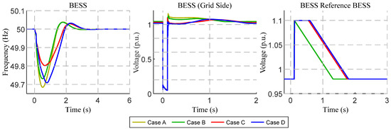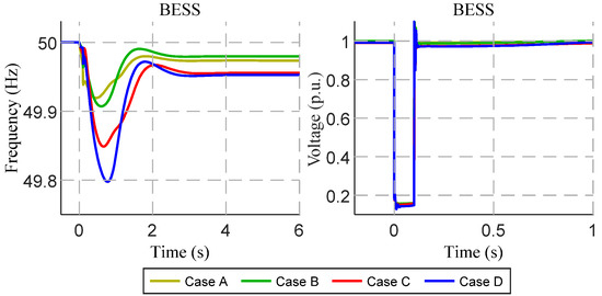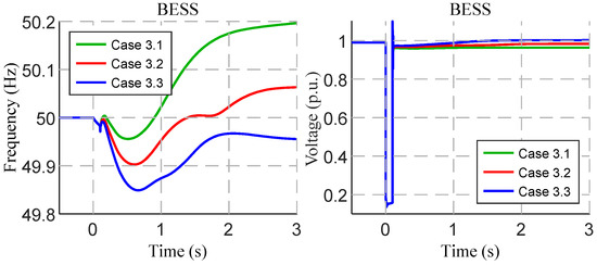 The results are presented in Figure 33, Figure 34, Figure 35 and Figure 36, with it being observed that only in Case 3 is the full recovery of all IM loads assured. Moreover, it is also verified that the BESS pre-fault frequency and voltage regime is achieved approximately 2 s after the fault clearance. In Figure 35, it is observed that the combination of the two presented control strategies induced a post-fault voltage increase, within the admissible range, that positively contributed to the reacceleration of all the IM loads.