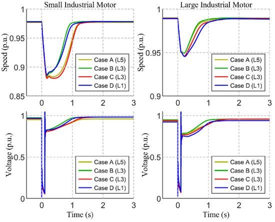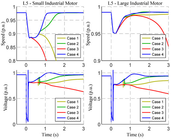In this subsection, it is intended to evaluate the influence of the IM load percentage on the BESS power converter sizing. Note that in the base case scenario (Section 4.2.1), 26.5% of IM load was considered. The results are presented in Table 3 (for the cases where L3 and/or L5 were not modeled as IM loads, their modeling is based on a constant impedance). A general trend to reduce the BESS power converter capacity with the reduction in the IM load ratio is verified. In fact, higher shares of IM loads will require larger reactive current consumption during the post-fault period, which in turn will induce a larger reactive current injection from the BESS power converter. However, the IM load location also presents some influence on the BESS power converter sizing. For instance, for the case where the IM load is only modeled by L1, the required BESS capacity is smaller than the base case, which presents a lower IM load ratio.