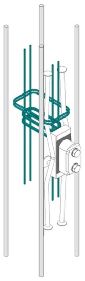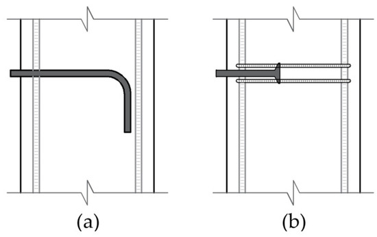 Thus, the traditional detail of beam-to-column joints (e.g., hook from reinforcement as shown in Figure 2a) can be substituted by a short steel anchor with supplementary reinforcement (e.g., in the form of stirrups (Figure 2b)). This solution’s main advantage is the unification and the possibility of repeated use of the same detail in the prefabrication process.
