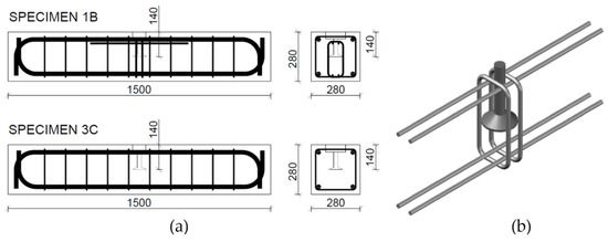 Reinforcement scheme of experimentally tested specimens: (a) global reinforcement of specimens; (b) detail of supplementary reinforcement.