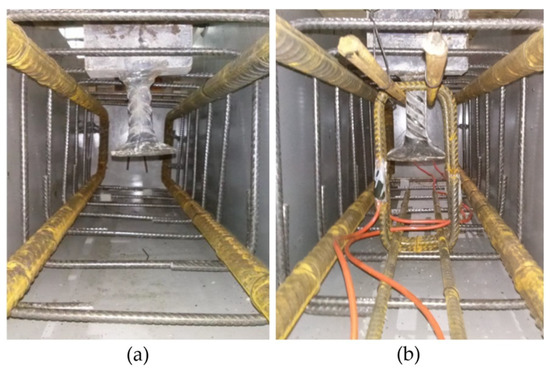 Specimens before casting: (a) specimen without supplementary reinforcement; (b) specimen with supplementary reinforcement.