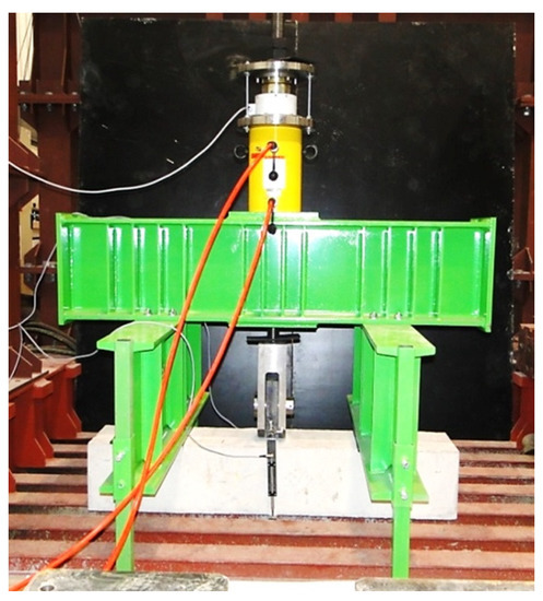 The performance of the experimental investigation and its overall set-up was adapted to the requirements of ETAG 001 [30,31]. The distances of the supports from the tested anchor were determined in such a way that it did not affect the measurement results. The test setup consisted of a steel frame, hydraulic hollow piston with pump, high strength steel pin, threaded rod, pair of the displacement transducers and force sensor. An overall view of the test setup is shown in Figure 5.