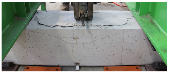 Deformation of the anchorage zone and the formation of cracks with a width greater than 0.5 mm—anchor with supplementary reinforcement (the picture does not show the longitudinal and shear reinforcement of the specimen).