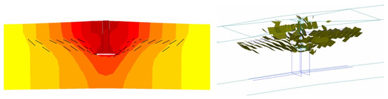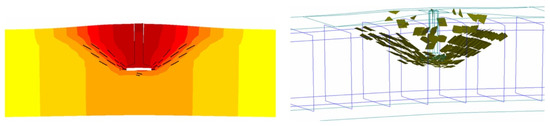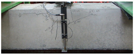 The deformation of the anchorage area in the specimen without supplementary reinforcement and the propagation of cracks larger than 0.5 mm is shown in Figure 16. The cracks’ positions correspond very well to the theoretical model, which assumes the propagation of cracks and the formation of a concrete cone at an angle of 35° [51].
