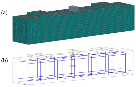 Numerical model: (a) macroelements with mesh; (b) longitudinal and shear reinforcement—1D elements.