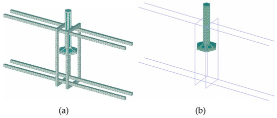 The head and shaft of the anchor were modelled as macroelements with a hexagonal cross-section. Adequate cross-sectional areas of the shaft and head of the actual anchor were respected. The longitudinal reinforcement of the beam and its shear reinforcement was modelled by 1D elements—truss elements (Figure 9b). The supplementary reinforcement was modelled in the first phases using 3D solid elements, while the shape of its cross-section was idealized as a square. Of course, adequate cross-sectional areas were preserved (Figure 10a). Later, a model with only 1D elements for all reinforcement was created (Figure 10b). After comparing both models, only small differences were found, so a simplified model of supplementary reinforcement was used for the needs of further simulations. The contact between steel plates (supports) and concrete macroelements was simulated as a perfect connection. There were modelled line supports on the steel plates’ top surface (in the middle of the surface) that allowed rotation and restrained the vertical and horizontal displacements.