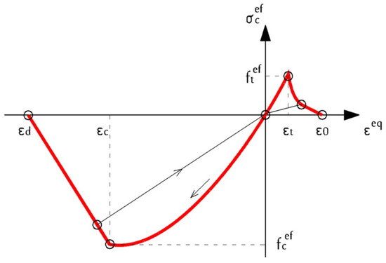 The concrete material characteristics were considered from the strength tests of the concrete cubes taken during specimen casting. In the numerical simulation, a brittle-plastic constitutive material model was used, which combines models for the description of the behavior of concrete under the tensile and compressive stress (3D non-linear cementitious 2). The plastic model of concrete with its compressive action is based on the Menétrey-Williams definition of the failure area’s shape [32]. This surface’s position is not fixed but may be varied and spread, simulating phase hardening and softening [33,34]. The fracture model is based on the classical formulation of the “smeared” cracks, which uses Rankine’s failure criterion [35] and exponentially reduced stiffness (softening). The material model also considers the wedging of the aggregate in shear (“Concrete Field Theory Aggregate Interlock”). The material model’s formulation is based on the decomposition of the resulting relative deformations into separate individual components of relative deformations—elastic εeij, plastic εpij and fracture εfij [26]. Figure 11 shows a diagram in the form of uniaxial stress and its associated relative deformation, where εt is the relative deformation corresponding to the maximum tensile strength of the concrete, ftef is the ultimate value of concrete tensile strength, εc is the relative deformation corresponding to the concrete’s maximum compressive strength, and fcef is the ultimate compressive strength of concrete.