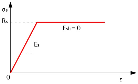 The initial ascending branch represents the material’s elastic action, taking into account the modulus of elasticity of the steel Es. After reaching the yield strength value, the simplified ideal plastic action of the material is considered. This simplification is acceptable in most numerical analyses of reinforced concrete members or structural details [45].