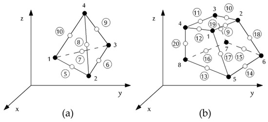 The geometry of the 3D solid elements [26,46]: (a) tetrahedral elements with 4 to 10 nodes; (b) brick elements with 6 to 15 nodes.