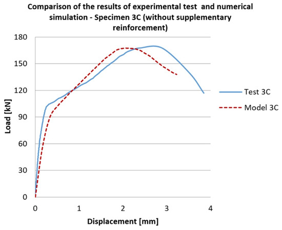 The numerical model described in Section 3 was created for a specimen without supplementary reinforcement. It was possible to analyze the formation of the first cracks, the failure mechanism and then determine the fundamental differences in resistance concerning other input parameters, especially the compressive strength of concrete. The numerical simulation results were compared with the experimentally obtained data from the test of specimen 3C. The relationship between load and displacement was used as the main parameter for comparing both analyses. Based on the graphs in Figure 15, it is possible to state a satisfactory agreement between the experiment and the numerical simulation. The correlation coefficient reaches a value of up to 0.96.