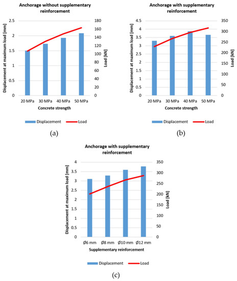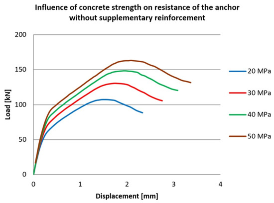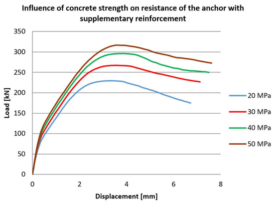 Similarly, a series of numerical simulations were performed on an anchor model with supplementary reinforcement. The anchor’s size and position and the specification of additional reinforcement (Ø 10 mm, fy = 500 MPa) remained as constant parameters. The graph in Figure 20 presents the influence of concrete strength on the resistance and stiffness of anchorage with supplementary reinforcement.