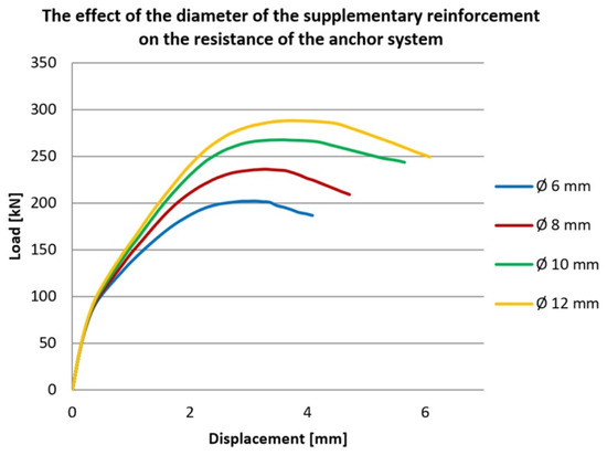The effect of the supplementary reinforcement’s diameter on the anchor system’s resistance and stiffness was another parameter that was investigated. However, the other parameters were retained: the arrangement of the reinforcement, the material characteristics of the reinforcement (fy = 500 MPa) and the concrete (fc,cube = 30 MPa), as well as the overall arrangement of the test setup and the test method. The increase in anchorage resistance on the change of the supplementary reinforcement diameter is shown in the graph in Figure 21.