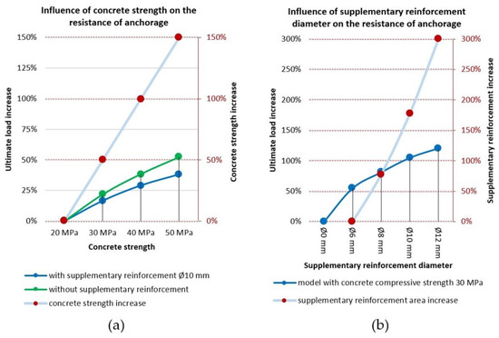 - According to the numerical analysis, the influence of concrete strength on anchorage resistance is non-linear, and it is higher for anchors without supplementary reinforcement.