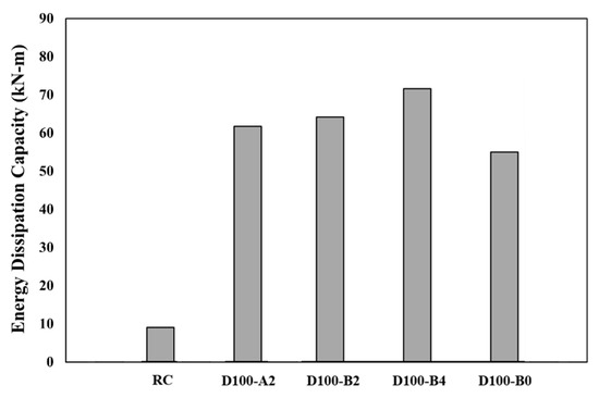 - The ductility and energy dissipation capabilities were compared and analyzed. Compared to non-retrofitted reinforced concrete beams, the ductility capacity increased by about 2.5 times, and the energy dissipation capacity increased by about seven times. This confirms that the application of the proposed retrofitting method can improve the structural performance of existing concrete members.