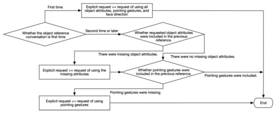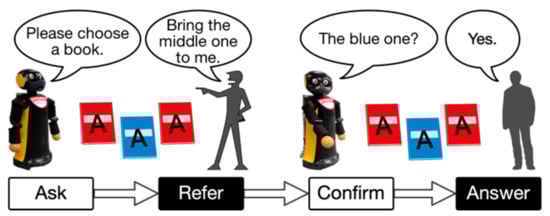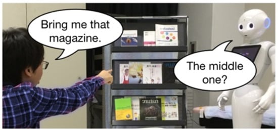 A simple strategy of the interactive approach is the explicit request. Based on the premise that humans refer to an object in an ambiguous way, some researchers have proposed an interactive strategy in which a robot explicitly asks users to provide additional information to identify an indicated object [1,7,8,9]. For example, Hattori et al. proposed a system that integrates deep learning-based object detection and natural language processing to calculate the ambiguity of referencing and request additional information for the ambiguous references [1]. Kuno et al. proposed a robotic system that requested users to provide additional information about an object that was difficult to detect [8]. The explicit request strategy focused on how to handle the ambiguity of references and decreased the ambiguity through additional information by users.
