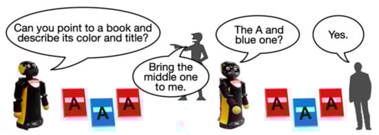 - Kimoto, M.; Iio, T.; Shiomi, M.; Tanev, I.; Shimohara, K.; Hagita, N. Improvement of Object Reference Recognition through Human Robot Alignment. In Proceedings of the 2015 24th IEEE International Symposium on Robot and Human Interactive Communication (RO-MAN), Kobe, Japan, 31 August–4 September 2015; pp. 337–342. [Google Scholar]