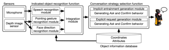 In contrast, some previous studies have suggested a strategy that changes ambiguous reference behavior into a clear one without explicit request. One concept leading to the strategy is entrainment. In human–human communication, humans curb such vast lexical choices and elicit terms through the phenomenon of entrainment; when humans are talking, they tend to adjust with an addressee such styles as lexical expressions [10,11,12], syntax [13], body movement [14,15,16], etc., and this phenomenon is known as entrainment, also known as alignment. The finding of entrainment inspired researchers of automatic speech recognition (ASR) improve the systems performance [17,18,19,20]. Fandrianto and Eskenazi proposed a strategy that changed ASR speaking styles and aligned users’ speaking styles, shouting and hyper articulation that decreased ASR performance, with the desired one for the performance [19]. While such studies focused on speech information in the field of ASR, they did not treat gesture information, such as pointing gestures that is useful information to recognize an indicated object. It remains unknown how to incorporate lexical and gestural entrainment to the robot conversation strategy for the indicated object recognition, and whether the strategy improves the recognition performance. In this study, we utilize the stance of using entrainment and propose a novel robot conversation strategy incorporating entrainment phenomenon, we call the proposed strategy implicit entrainment, to improve the performance of indicated object recognition, which implicitly clarifies users’ indications through human–robot interaction.