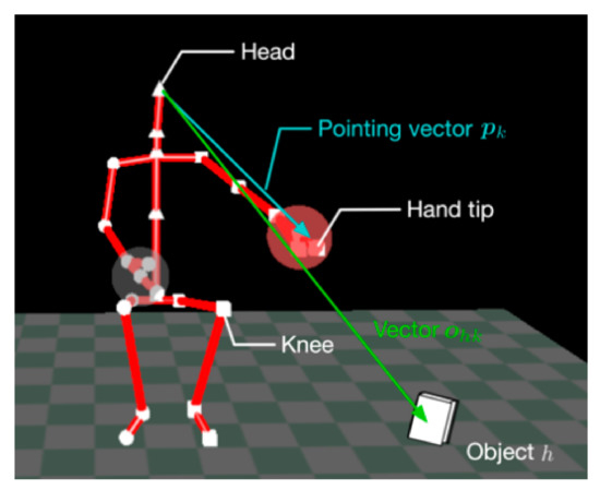 Here , and indicate the pointing vector and the vector connecting a human head and an object, respectively, on the k-th data with a pointing gesture. indicates the probability that the object h is pointed at, and the angle between and is defined as a random variable and modeled using the normal distribution function as .