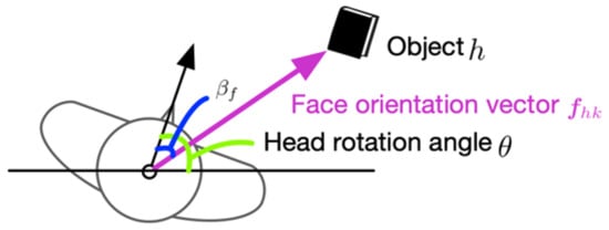 where indicates the face orientation vector on the k-th data. The angle between and the vector connecting a head and an object is obtained in a similar way to Equation (2) Codomain of is because objects are in front of a person. The likelihood based on face direction recognition is defined as follows: