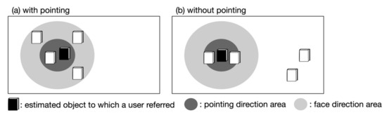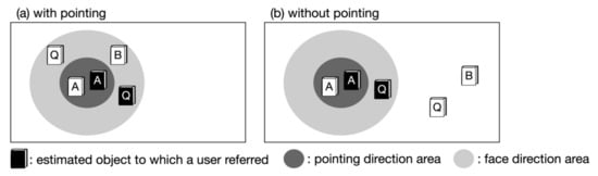 For example, Figure 8a shows a situation using a pointing gesture: there are two objects in the pointing direction area, and the minimum attribute sets are “black and A” and “white and A”. The minimum attribute is “black”. The right side of Figure 8b shows a situation without using a pointing gesture: three objects are located in the facing direction area and the minimum attribute sets are “black and A,” “white and A,” and “black and Q”. The minimum attributes are “black and A”.