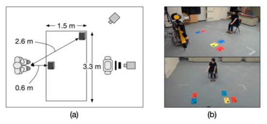 The face direction recognition module calculates the normalized reference likelihood of each object based on face orientation data from the depth image sensor and the objects’ position data stored in the object information database. The detection section for the face direction recognition is the same as that for the pointing gesture recognition. Thus, the module calculates temporal likelihood according to the data obtained from the depth image sensor per 0.3 s. The module then calculates the mean of the temporal likelihood of each object as the likelihood based on face direction recognition. The face direction recognition uses the angle formed by the face orientation vector on a level surface and the vector connecting a head and an object (Figure 6). The face orientation vector is calculated based on the head rotation angle () rad obtained from the depth image sensor. If is below rad, the person is considered to be viewing the object; its likelihood is 1, and otherwise 0. This threshold is set because a humans’ field of view is rad at most [38]. The likelihoods are normalized from 0 to 1.