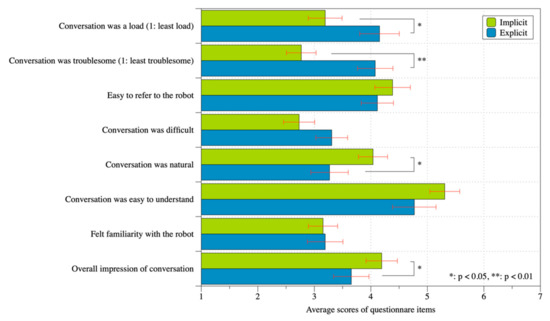 Questionnaire results of conversation impressions with standard error.