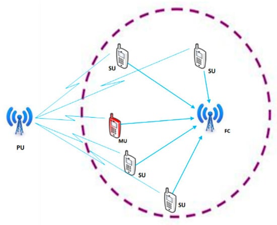 Various techniques are used to efficiently utilize the scarce spectrum by merging the underlay and overlay methods in hybrid cognitive radio networks []. However, spectrum sensing is highly vulnerable to fading and hidden terminal problems between the PU and the SUs [,]. Thus, the decision of the spectrum sensing performed by a single SU is neither sufficient nor reliable for final decision about the presence of the PU in the network. To overcome the problem of the single SU sensing, researchers take advantages of cooperative spectrum sensing (CSS) for the enhancement of spectrum sensing. In CSS, each single SU gathers information about the PU channel, and shares its local sensing information with the FC, which accumulates the sensing information from the SUs and declares the global decision about the presence of the PU in the network [,]. In CSS, the SUs send information to the FC in two ways. In the first scenario, the SU sends a single bit of information to the FC, which is also known as the hard-decision rule. In the second scenario, which is called the soft combination rule, the SU sends a sampled energy value to the FC [,].
