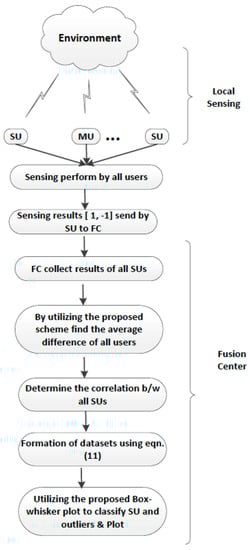 Since the outliers have different responses in Equation (11) than the normal SUs, they are classified as outliers with Equation (14). The overall flow chart of the proposed scheme is shown in Figure 2.