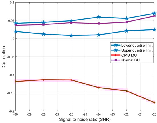 Correlation vs. signal-to-noise ratio (SNR), when an opposite malicious user (OMU) exists in the network.