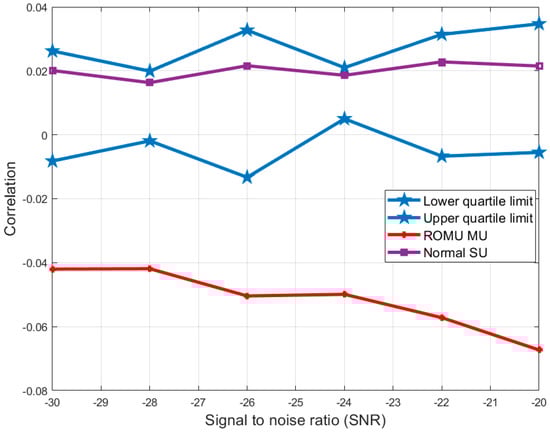 Correlation vs. SNR, when a random opposite malicious user (ROMU) exists in the network.