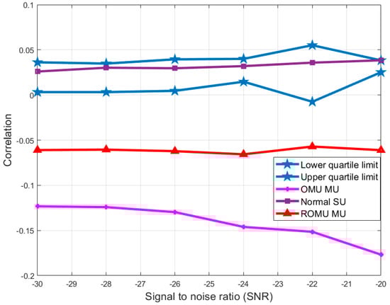 In the third scenario, we considered the existence of both the OMU and ROMU in the network. Table 4 defines the upper and the lower quartile limits for the normal SUs. Figure 5 shows the simulation results, when both the OMU and the ROMU are equally distributed. From Figure 5, we can observe that the normal SUs lie within the range of the upper and lower limits, whereas the OMU and ROMU are not in the range of the limits set by the box-whisker plot. Figure 5 shows that the detection results of the OMU were more negative compared to the ROMU. The ROMU behavior was closer to that of the normal SUs and more sensitive care was required for the detection of such outliers or of the MUs.