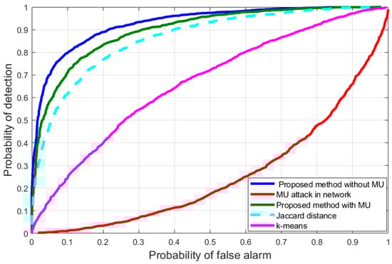 In Figure 6, we show the receiver operator characteristics (ROC) comparison of the proposed scheme with other existing schemes when the MU was present in the network, and when the MU did not exist in the network. Figure 6 demonstrates that when no scheme was applied, the probability of detection decreased and the probability of false alarm and probability of misdetection increased. Furthermore, when the proposed scheme was applied in the presence of MU, the performance was better than other existing schemes.