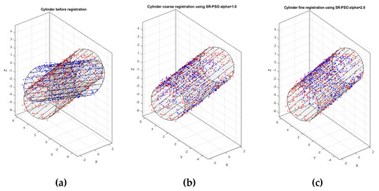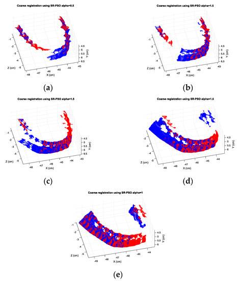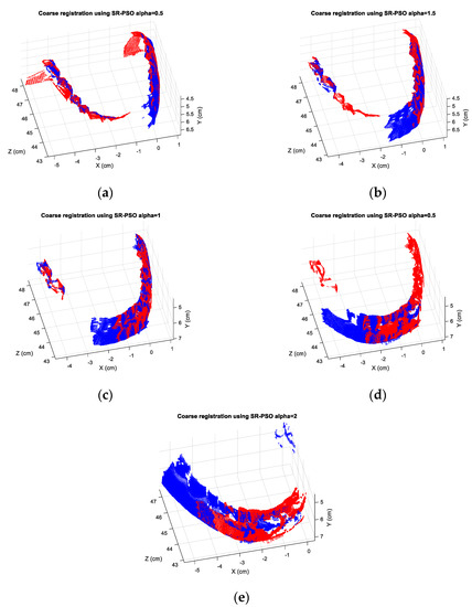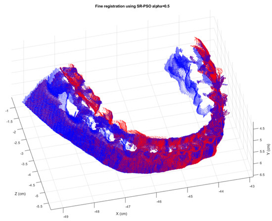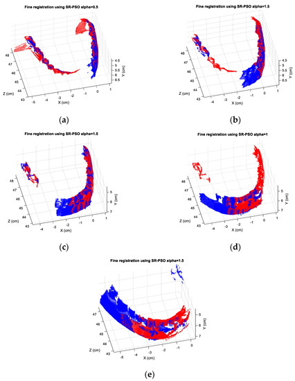 The registration mean-squared errors (MSEs) using the SR-PSO algorithm with and without refining with the ICP method are shown in Table 3. The best result is when α = 1.5 with an extremely tiny error of 3.22 × 10−31. The best final registration result is also shown in Figure 5.