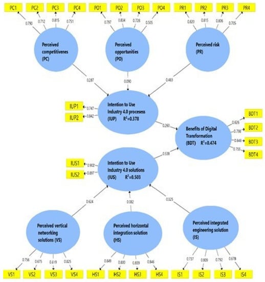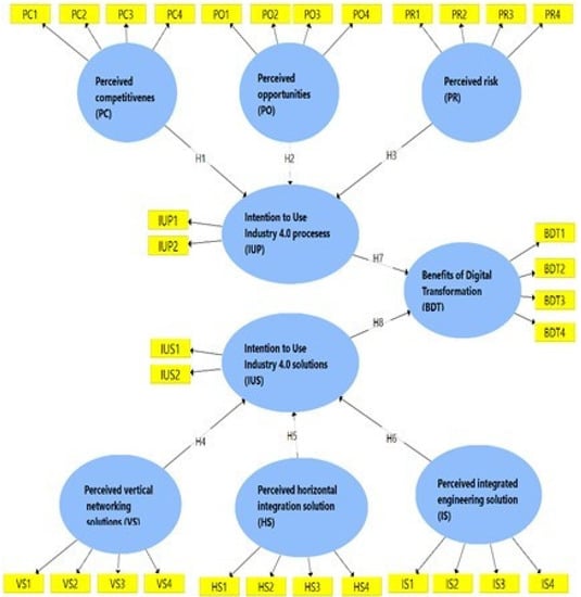 For the implementation of any type of technology, the study of human behavior is used as part of the information system and the most significant is the unified theory of acceptance and use of technology (UTAUT) [35] that helps predict technology acceptance in organizational implementations. Developed by reviewing and consolidating several models (motivated action theory, TAM 1, model of PC use (MPCU), planned behavior theory, motivational model, TAM and TPB combined, social cognitive theory and innovation diffusion theory), UTAUT is based on four key exogenous or independent variables that affect the behavioral intent to use the technology, namely: (a) performance expectancy, (b) effort expectation, (c) behavioral social influence and (d) facilitation conditions with a direct impact on use of technology [36]. Compared to the existing studies of the specialists [37,38], we considered the following variables as representative for our Romanian study: Intention to Use Industry 4.0 processes (IUP) with the three influences (Perceived competitiveness (PC), Perceived opportunities (PO), Perceived risk (PR)), Intention to Use Industry 4.0 solutions (IUS) with three influences (Perceived vertical networking solutions (VS), Perceived horizontal integration solution (HS), Perceived integrated engineering solution (IS)) and Benefits of Digital Transformation (BDT). By creating a new conceptual model based on these variables, our study covers some existing gaps in the literature and opens new opportunities for future research in both academia and business. The relationship between the four exogenous variables of the UTAUT model and the three variables that inform the proposed model (IUP, IUS and BDT) are described below.