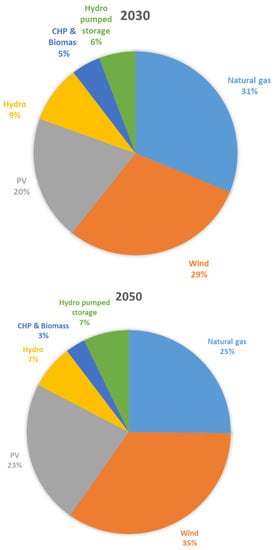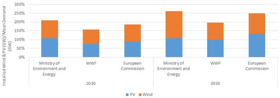 In this connection, the reference scenario by 2030 for wind and PV capacity refers to a cumulative capacity of up to 16 GW (8 GW wind, 8 GW PV). By 2050, it is assumed that the renewable energy sources’ capacity, i.e., wind and PV, will account for 18 GW aggregated, with wind installations of 9 GW and photovoltaic of 9 GW. The normalized wind and PV capacities (by the average annual demand) are 1.83 by 2030 and 2.48 by 2050, close to the relative normalized capacities in the corresponding studies discussed and presented in Figure 1.