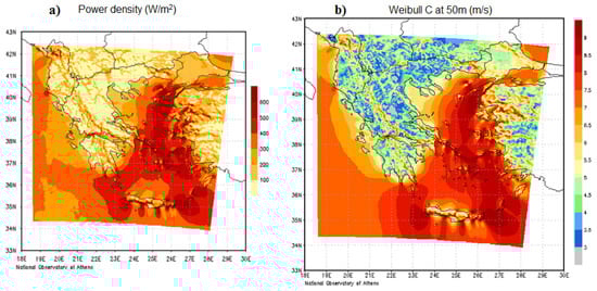 In this connection, high resolution analytical wind data timeseries for typical wind year are used. These data have been produced by the systematic application of a numerical weather prediction model. Analytical presentation and description of the approach was given in []. In Figure 2, the relative high resolution wind atlas of Greece is presented in terms of power density and parameter c of Weibull distribution, which are the most common ways to present Aeolian maps. The wind atlas of Greece was based on a typical wind year and 12 months of weather model simulations for grid boxes 2 × 2 km2 in size. The numerical weather prediction model used is “MM5” which is run operationally at the National Observatory of Athens since 2002 [] and has been verified [,] for its forecast skill over the area of interest.