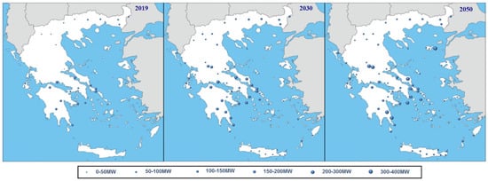 Renewable energy sources shall substantially contribute towards the achievement of decarbonization targets set for the energy sector. One of the main objectives of energy planning is the increase of renewable energy sources’ share in the energy mix, in order to substitute part of the conventional units’ production. In the renewable sources capacity development scenarios, reference is mainly made to large penetration of wind and photovoltaic systems. In the corresponding studies, wind installations’ capacity is projected to reach, according to Ministry of Environment and Energy in 2030, approximately 7 GW, while by 2050 11–18 GW (off-shore wind installation included) []. According to a study conducted by European Commission, by 2030, wind installations’ capacity may reach 6 GW and by 2050 7.8 GW []. In addition, World Wide Fund for Nature (WWF) estimates that the wind installations will account for 5 GW, in 2030, and 6.7 GW, in 2050 []. Moreover, the increase of PV capacity is projected, according to the Energy Roadmap by the Ministry of Energy (the National Energy and Climate Plan and the Long-term strategy towards 2050), for 2030 at 7.7 GW, while for 2050 it is estimated at 8–12 GW, depending on the scenario considered [,]. According to a study conducted by the European Commission for Greece, in 2030, it is estimated that 5.6 GW of PV will have been constructed, while by 2050 9 GW []. Furthermore, according to WWF’s projections, PV capacity will reach 4.8 GW by 2030 and 7.1 GW by 2050 []. Table 1 presents forecasts on the cumulative capacity of PV and Wind in Greece by 2030 and 2050 [,,,].