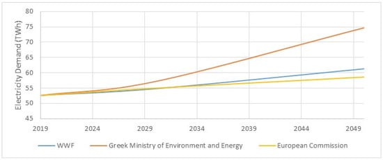Actual time series of load demand data for the interconnected power system have been used (Power Public Corporation S.A. data, https://www.dei.gr/en, accessed on 15 January 2021). Corresponding adjustments to the demand time series were realized in order to formulate the corresponding timeseries for the years 2030 and 2050. The base year for the load demand time-series is 2006. This is the last year before the start-up of PV development in Greece. The forecasts for annual electricity demand and peak power demand are based on relevant studies that have been conducted for the power system of Greece. The comparative study of the researches carried out for Greece’s future demand concludes that, in 2030, a modest estimation is considered to be 57.2 TWh with a peak demand of 10.5 GW, while for 2050, 74 TWh with a peak demand of 13 GW. The studies that were taken into consideration were conducted by the Ministry of Environment and Energy [], the European Commission [] and WWF []. A comparative representation of the electricity demand forecasts is presented in Figure 5.